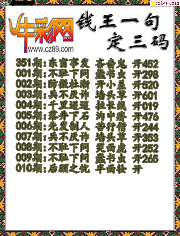 > 福彩3D2026010期钱王一句定三码字图谜